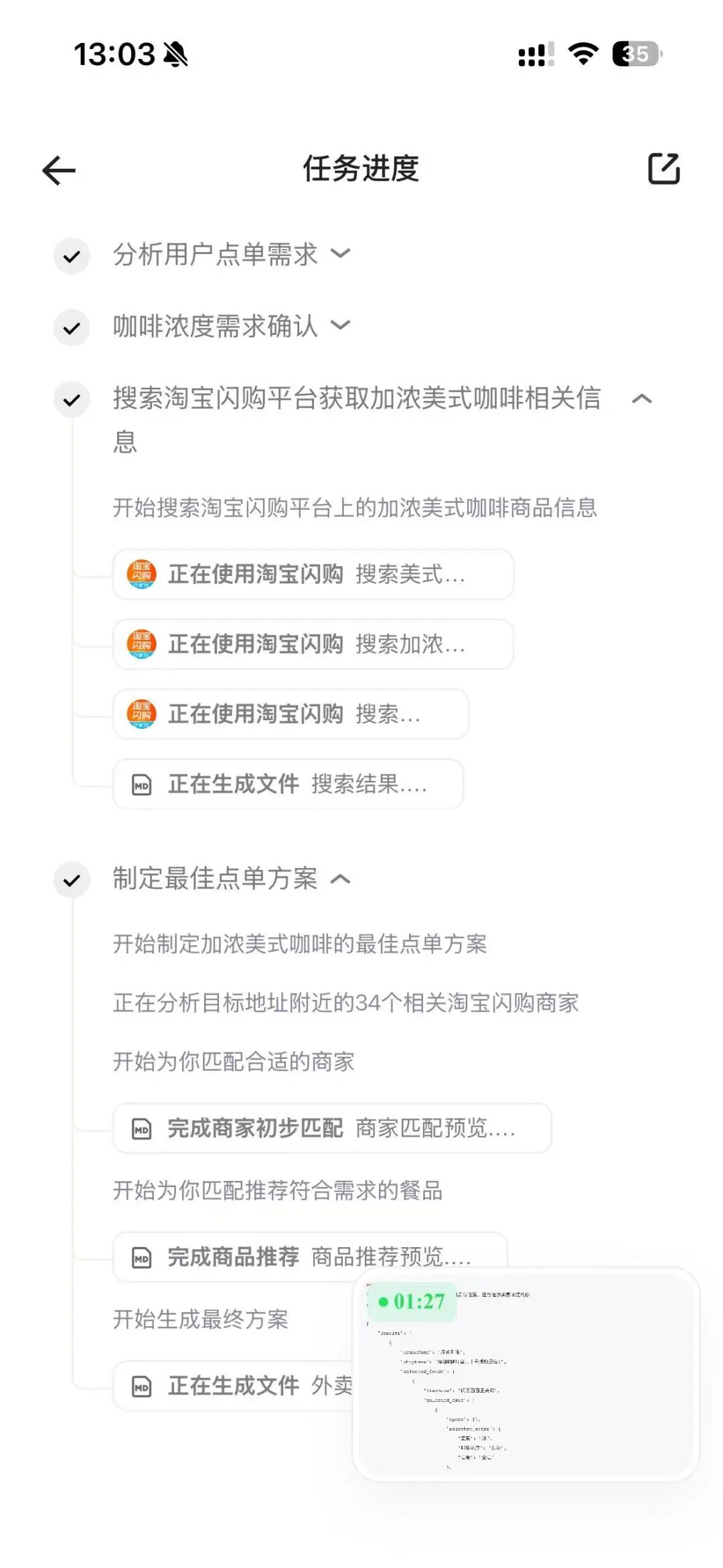 随后,系统自动计算优惠;支付也直接在对话框内完成。整个过程约一分钟,除了输入支付密码,几乎不需要再进行其他手动操作。